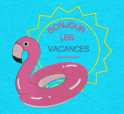 Motif de broderie machine bonjour les vacances ,qui représente une bouée en forme de flamant rose avec un soleil . vivement l’été !!!