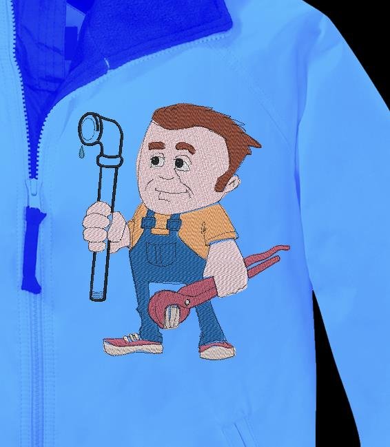 motif de broderie machine d’ un plombier avec son tuyau et son outil de travail