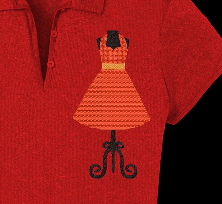 Motif de broderie machine d’une ancienne robe vintage des années 50 sur un grand buste de couture mannequin