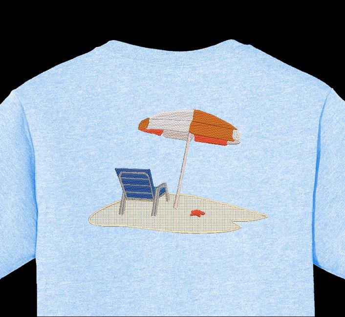 Motif de broderie machine d’un fauteuil de plage avec un grand parasol blanc et orange ainsi qu’une étoile de mer sur le sable fin de la plage