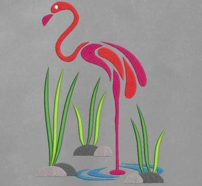 Motif de broderie machine d’une silhouette de flamant rose au milieu d’un étang avec ses pierres et ses roseaux.